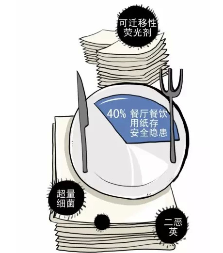 數(shù)據(jù)顯示,85%的消費(fèi)者每周至少在外就餐一次,87.6%的消費(fèi)者會(huì)使用餐廳提供的免費(fèi)餐巾紙。由此可見,紙品已成為餐飲企業(yè)消費(fèi)環(huán)節(jié)重要消耗品。然而這些紙張的安全性到底如何?